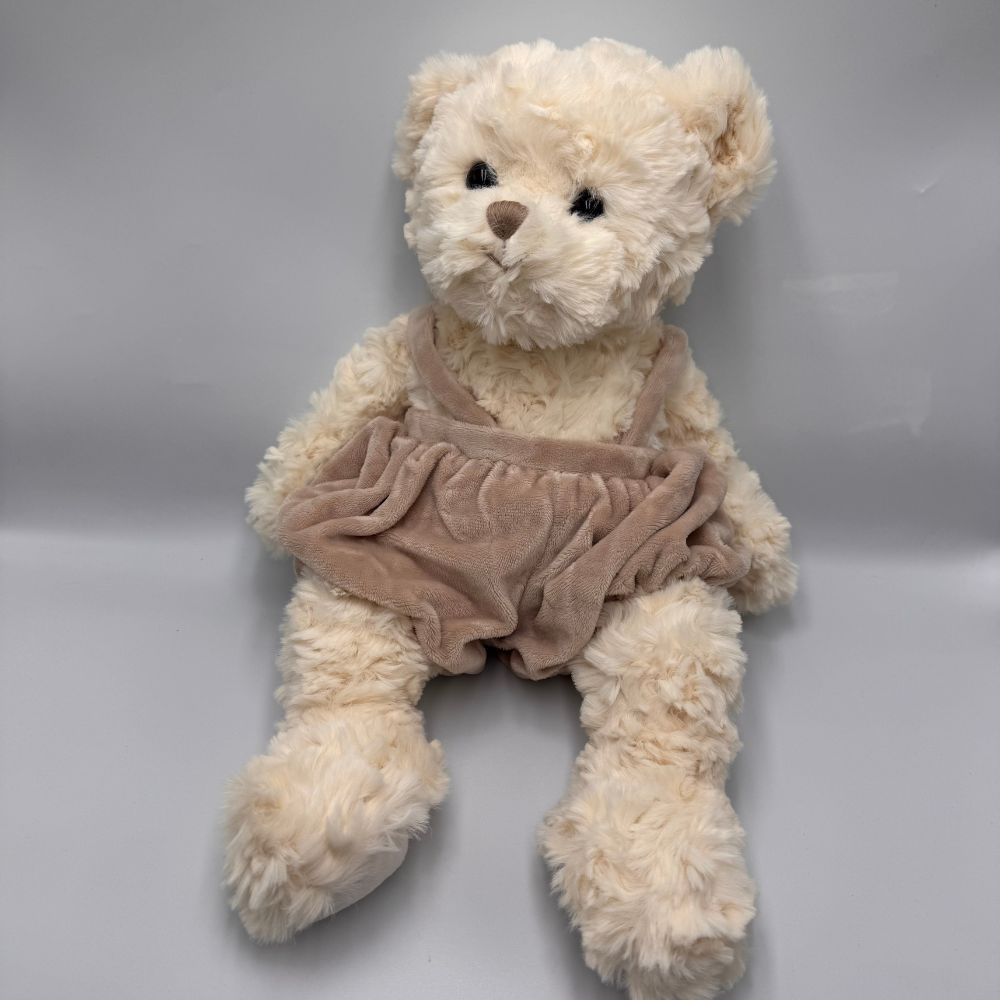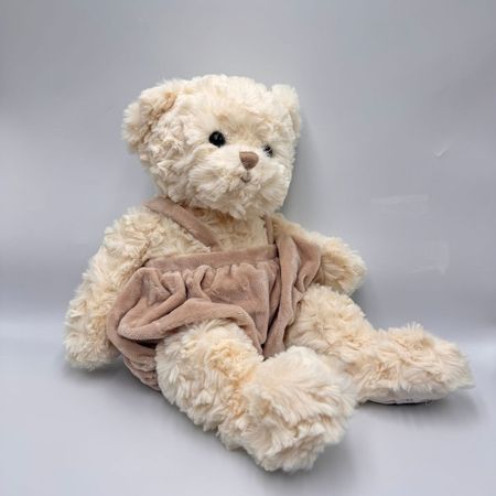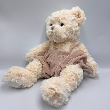 Brązowe ogrodniczki podkreślają jego prosty, klasyczny styl i sprawiają, że Adam prezentuje się wyjątkowo uroczo. Na jednej ze stóp znajduje się wyszyty napis MY FIRST TEDDY, który symbolicznie wskazuje, że to doskonały wybór na pierwszego misia – pamiątkę na lata i bezpiecznego towarzysza codziennych zabaw.