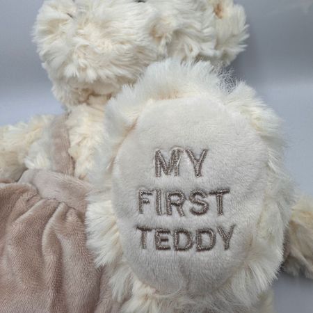 -Napis MY FIRST TEDDY – świetny wybór na pierwszą przytulankę dla dziecka.