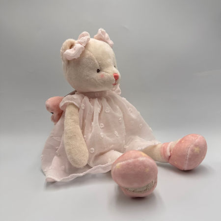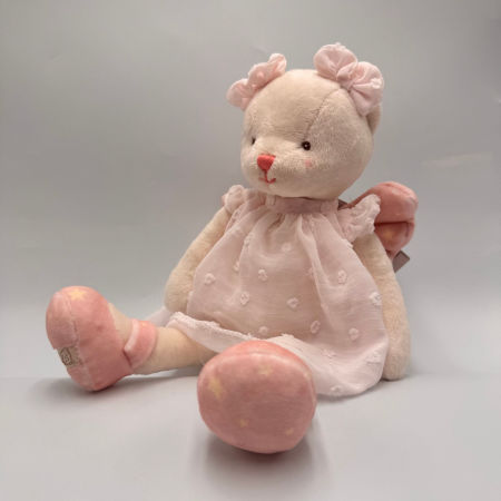 Angelina to uroczy biały miś Bukowski ubrany w elegancką różową sukienkę, zdobioną skrzydełkami i kokardkami przy uszach. Jej piękne, dopasowane buciki dopełniają wyjątkowego wyglądu, tworząc komplet gotowy na prezent.