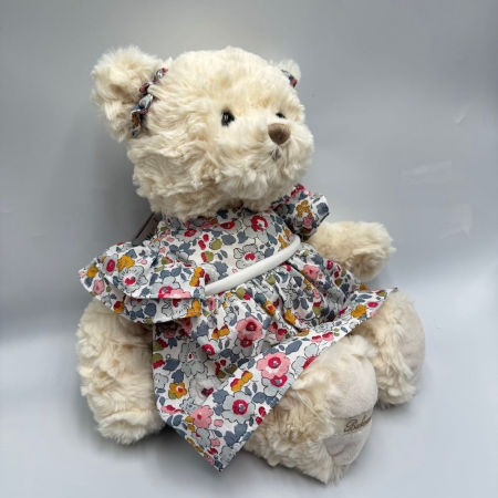 Pluszowy miś BUKOWSKI Anni – biały miś w kwiecistej sukience i niebieskich kokardkach