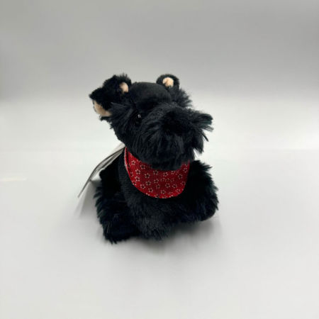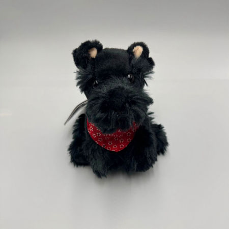 Baby Elvis to uroczy czarny piesek w kształcie sznaucera o długości około 15 cm. Posiada akrylowe oczka, wyszyty pyszczek i nosek, a kontrastujące jasne wnętrze uszu nadaje mu sympatyczny wyraz. Na szyi nosi czerwoną apaszkę, która dodaje mu elegancji i charakteru. Mięciutkie, czarne futerko zachęca do przytulania, a wypełnienie groszkiem syntetycznym sprawia, że piesek jest lekki i przyjemny w dotyku.