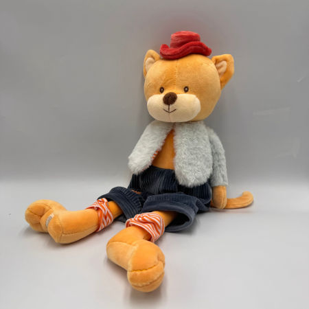 Żółty kotek ubrany w niebieską kurteczkę i spodenki oraz czerwony kapelusik