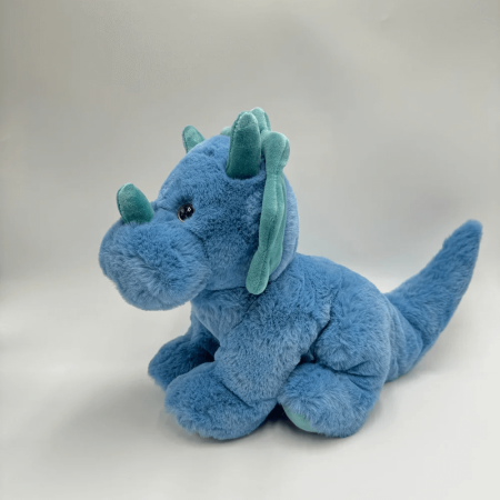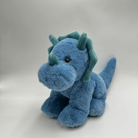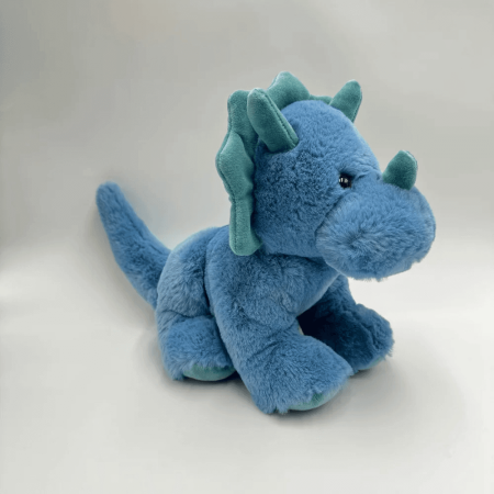 Przedstawiamy wam maskotkę Tricy, przypominającą sympatycznego triceratopsa. Ma krótkie, miękkie futerko w intensywnym, niebieskim kolorze, które jest niezwykle przyjemne w dotyku. Wokół głowy znajduje się charakterystyczna zielono-niebieska kryza, a na głowie widoczne są trzy małe rogi, co podkreśla wygląd triceratopsa. Tricy ma urocze, czarne akrylowe oczka, a jego pyszczek ozdobiony jest subtelnym, haftowanym uśmiechem.