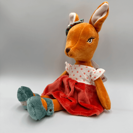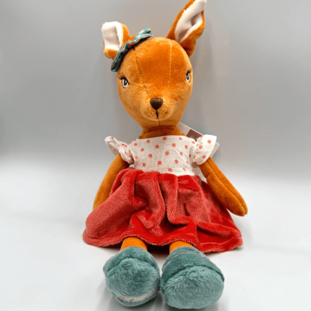 Happy Helga to elegancka i urocza przytulanka w formie jelenia, która łączy styl i funkcjonalność. Wykonana z rudego, miękkiego futerka, jest niezwykle delikatna i idealna dla dzieci od pierwszych dni życia. Charakterystycznym elementem Happy Helgi są jej błękitne buciki oraz kokardka, które dodają jej niezwykłego uroku. Sukienka w intensywnym, czerwonym kolorze podkreśla elegancję maskotki i doskonale współgra z jej radosnym wyglądem.