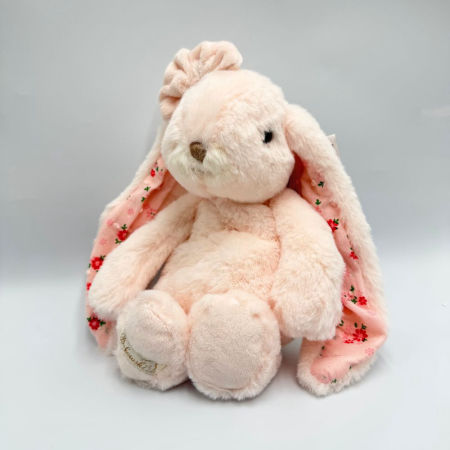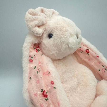 Junior Kanina – Floral to uroczy pluszowy króliczek w subtelnym, różowym kolorze, który zachwyca swoją delikatnością i eleganckim wyglądem. Jego mięciutkie futerko jest niezwykle przyjemne w dotyku, a wyjątkowego charakteru nadają mu detale: urocza kokardka pod szyją oraz wnętrze uszu ozdobione kwiecistym wzorem.
