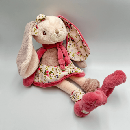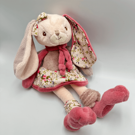 Bibi to urocza królicza dziewczynka, która oczaruje każde dziecko. Jej długie, miękkie uszy sprawiają, że jest idealną przytulanką, a elegancka sukienka w odcieniach różu i fioletu, ozdobiona kwiecistymi detalami, dodaje jej wyjątkowego wdzięku. Głowę Bibi zdobi urocza kokardka, która podkreśla jej dziewczęcy styl. Oczka i pyszczek króliczki zostały starannie wyszyte brązową nicią, co nadaje jej przyjazny i łagodny wyraz. Mając 25 cm wysokości, Bibi jest doskonałym wyborem dla najmłodszych, oferując zarówno zabawę, jak i komfort przytulania.