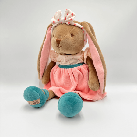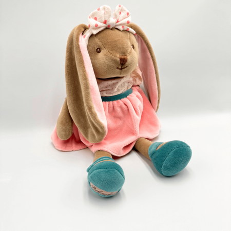 Bunny Sisters to urocze, małe króliczki, wykonane z niezwykle miękkiego materiału, który sprawia, że są idealnymi przytulankami dla dzieci. Króliczki mają starannie wyszyte oczka i pyszczki, które nadają im wyjątkowego, przyjaznego wyglądu. Ubrane w rozkloszowane sukienki w pięknych kolorach, króliczki dodatkowo ozdobione są uroczymi bucikami oraz opaskami z kokardkami na głowach. W wariancie jasnoróżowym, króliczek w jasnobeżowej sierści z jasnoróżową sukienką to urocza przytulanka, która wnosi radość i komfort do każdego pokoju dziecka. Z wysokością 30 cm, idealna na prezent.