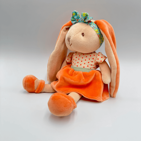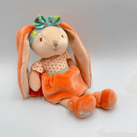 Little Bunny Sisters w pomarańczowej sukience to doskonała przytulanka, która zachwyca swoją delikatnością i urokiem. Ten królik o miękkim, pluszowym futerku został starannie wykonany z myślą o bezpieczeństwie najmłodszych. Haftowane oczka i pyszczek nadają mu przyjazny wyraz, a długie uszy dodają mu subtelnego charakteru. Pomarańczowa sukienka królika harmonizuje z uroczymi bucikami i opaską, które nadają mu wyjątkowy styl. Przytulanka o wysokości 20 cm jest idealna do codziennego towarzyszenia dziecku i jako element dekoracyjny pokoju malucha.