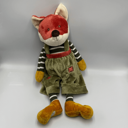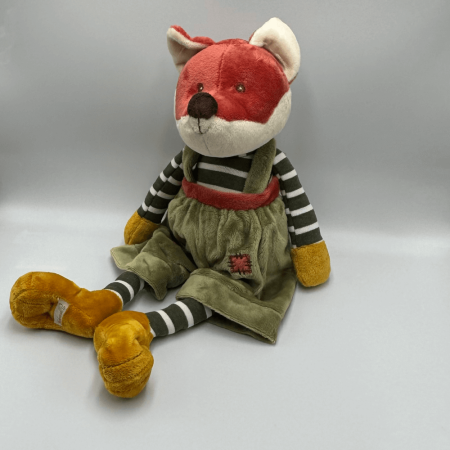 Wyjątkowego charakteru nadają mu kontrastowe, żółte łapki oraz starannie wyszywane brązową nicią pyszczek i oczka, które tworzą przyjazny i ciepły wyraz. The Big Foxy ubrany jest w zielone spodnie ozdobione czerwonymi łatkami oraz pasiastą koszulkę, co dodaje mu radosnego, kolorowego wyglądu. To idealna zabawka, która wniesie do dziecięcego świata zarówno radość, jak i poczucie bezpieczeństwa.