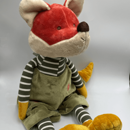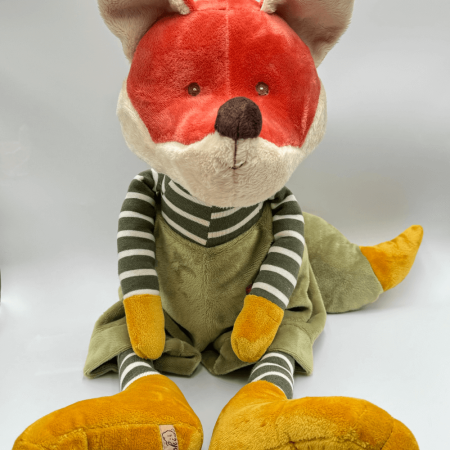 Charakterystyczne żółte łapki liska kontrastują z jego rudą sierścią, podkreślając jego niepowtarzalny design. The Great Foxy nosi zielone spodnie ozdobione czerwonymi łatkami, a także pasiastą koszulkę, tworząc zestaw pełen radości i kolorów. To idealny towarzysz dla dzieci w każdym wieku, wnosząc ciepło i radość do każdego dziecięcego pokoju.