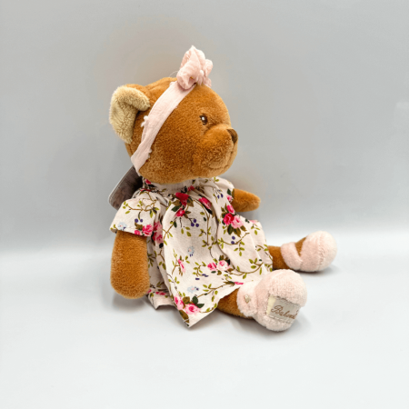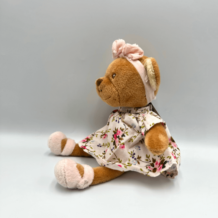 Baby Meli to uroczy, brązowy niedźwiadek o krótkim futerku, który zachwyci każdego maluszka! Jego czarne akrylowe oczka oraz pyszczek wyszyty brązową nicią nadają mu wyjątkowego uroku i sprawiają, że wygląda bardzo przyjaźnie. Baby Meli ubrany jest w urokliwą sukienkę w różowe kwiatki, która podkreśla jego dziewczęcy charakter. Sukienkę dopełniają różowe buciki oraz opaska na głowie, co nadaje całości subtelnej elegancji. Dzięki wysokości 20 cm, Baby Meli jest doskonałym towarzyszem dla najmłodszych, idealnym zarówno do przytulania, jak i zabawy. Jest to maskotka, która zapewnia komfort, bezpieczeństwo i radość każdemu maluszkowi.
