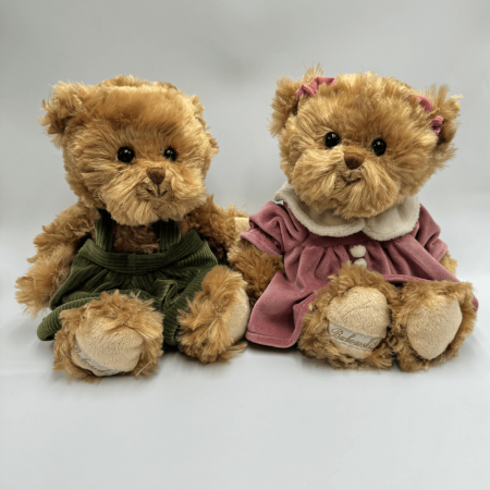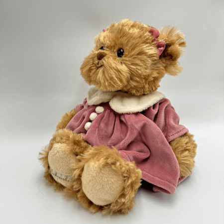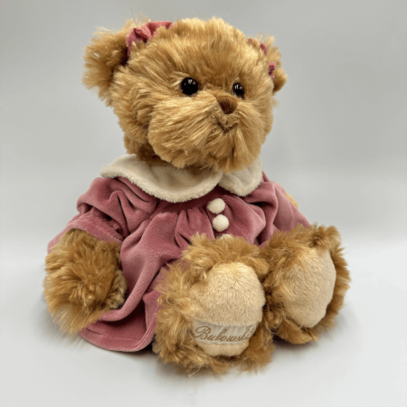 Miś Bukowski Géraldine to wyjątkowa maskotka, która wyróżnia się elegancją i dbałością o szczegóły. Jej jasno brązowe, miękkie futerko o średniej długości zachęca do przytulania, a błyszczące, czarne akrylowe oczka dodają jej uroku. Géraldine ubrana jest w stylową fioletową sukienkę z białym kołnierzykiem oraz delikatnymi guziczkami, co podkreśla jej szykowny wygląd. Dodatkowo, kokardki w kolorze sukienki zdobią jej uszka, dodając dziewczęcego wdzięku i klasy.