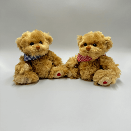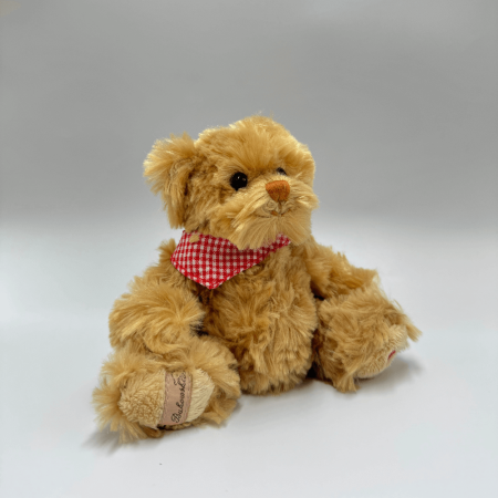 Miś Bukowski Herman z czerwoną chusteczką to urocza maskotka, która idealnie łączy prostotę z wyjątkowym stylem. Jego mięciutkie, beżowe futerko średniej długości zachwyca swoją delikatnością, a starannie wyszyty brązową nicią pyszczek oraz czarne akrylowe oczka dodają mu sympatycznego wyrazu. Na lewej stopie miś ma wyhaftowane czerwone serduszko – subtelny detal, który czyni go jeszcze bardziej wyjątkowym. Elegancka, kraciasta czerwona chusta przewiązana pod szyją podkreśla jego charakter i dodaje mu klasycznego uroku.