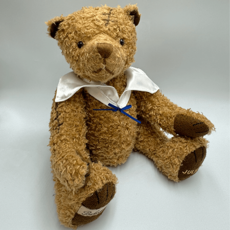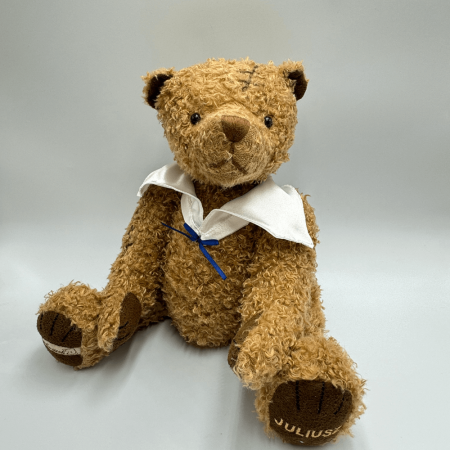 Juliusz posiada wyhaftowany pyszczek i czarne akrylowe oczka, które podkreślają jego klasyczny, elegancki wygląd. Ten wyjątkowy miś mierzy około 30 cm i jest częścią limitowanej serii zaprojektowanej na cześć Teatru im. Juliusza Słowackiego w Krakowie. Dzięki temu, miś ma nie tylko estetyczny, ale i kulturowy wydźwięk, który przyciąga uwagę miłośników tradycyjnego stylu.