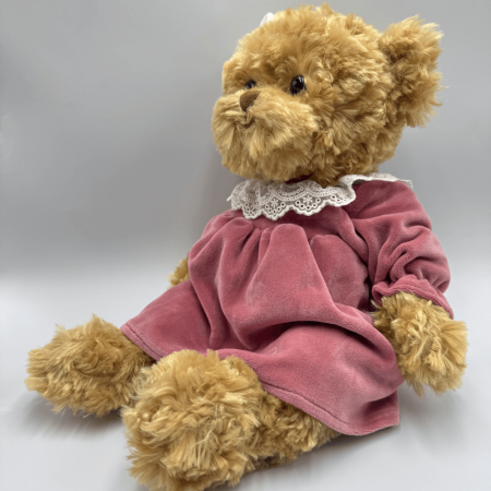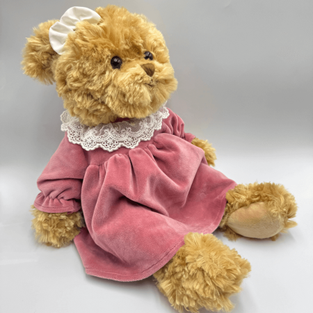 Miś Bukowski Lisen to kwintesencja dziewczęcego uroku i klasy. Jej miękkie, brązowe futerko otula wrażeniem ciepła i bezpieczeństwa, co czyni ją idealnym towarzyszem każdej dziewczynki. Lisen zachwyca swoją subtelną różową sukienką z białym kołnierzykiem, która dodaje jej elegancji i stylu. Biała kokardka na głowie to mały, lecz wyrazisty akcent, podkreślający jej wyjątkowy charakter.