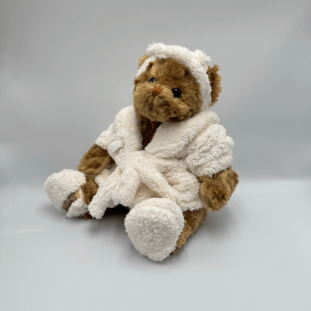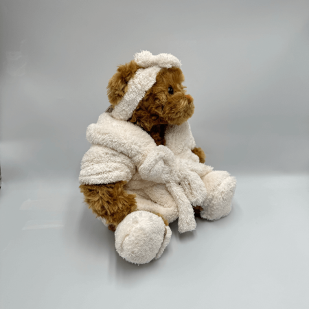 Mrs Bukowski to wyjątkowy pluszowy miś, który łączy w sobie delikatność, elegancję i funkcjonalność. Jej średniej długości futerko w ciepłym, brązowym odcieniu jest niezwykle miękkie i przyjemne w dotyku, co czyni ją idealną towarzyszką do przytulania. Mrs Bukowski jest ubrana w cieplutki biały szlafrok oraz pasujące pantofelki, które dodają jej niepowtarzalnego uroku. Opaska na głowie, wykonana z tego samego materiału co szlafrok, podkreśla jej subtelny, dziewczęcy wdzięk.