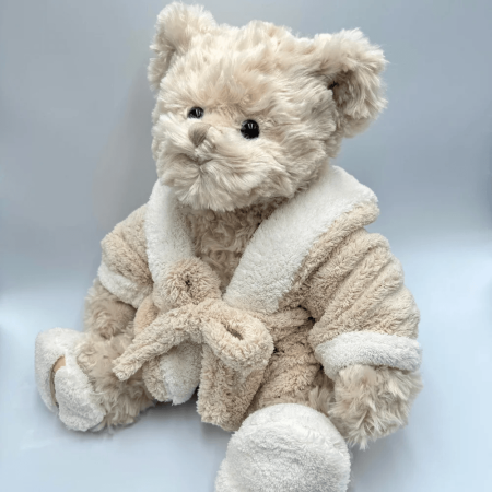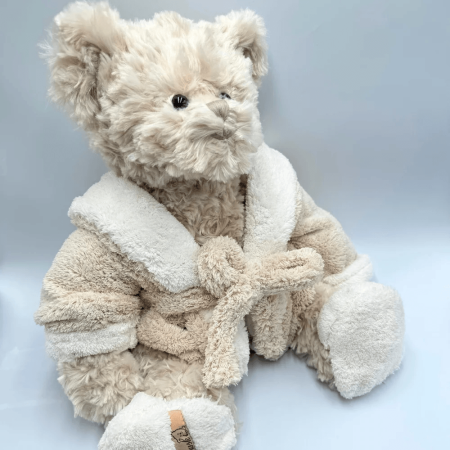 Sir Hamilton to elegancki miś o jasno szarym futerku, który swoim wyglądem przyciąga uwagę każdego, kto ceni klasyczny styl. Z wysokością 40 cm jest doskonałym towarzyszem zabaw i przytulania. Jego czarne akrylowe oczka oraz starannie wyszyty pyszczek nadają mu przyjazny i pełen ciepła wyraz. Sir Hamilton nosi beżowy szlafrok i pasujące pantofelki, co podkreśla jego elegancki charakter. Jest to świetna przytulanka dla wszystkich, którzy szukają nie tylko towarzysza zabaw, ale także pięknej dekoracji.