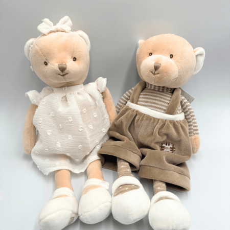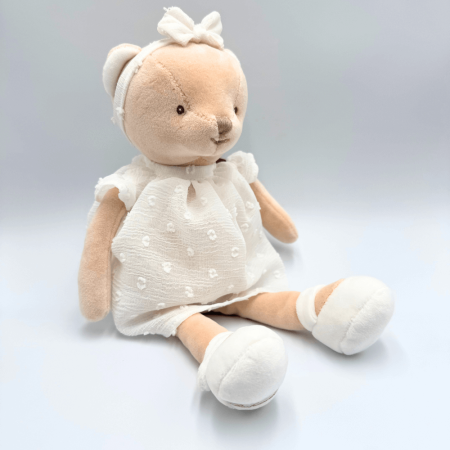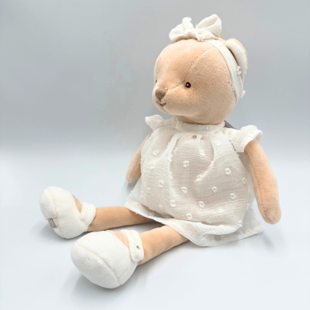Miś Melissa to wyjątkowa przytulanka, stworzona z myślą o najmłodszych. Wykonana z miękkiego, krótkiego materiału, który jest bardzo przyjemny w dotyku, Melissa ma starannie haftowane brązowe oczka i pyszczek, co nadaje jej łagodny i delikatny wyraz. Ubrana w elegancką białą sukienkę i ozdobiona kokardką na głowie, miś prezentuje się niezwykle uroczo. Na stopach nosi białe butki, które dopełniają jej stylowy wygląd. Miś Melissa ma wysokość 30 cm, dzięki czemu jest idealnym towarzyszem do przytulania i zabawy, a także świetnym pomysłem na prezent dla maluszka. Do przytulanki dołączone jest eleganckie pudełko prezentowe Gift Box.