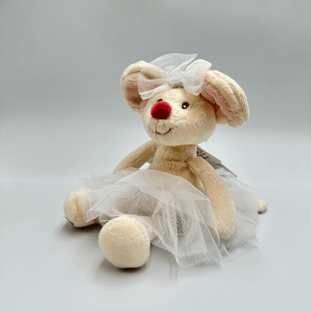 Antonia jest uszyta z miękkiego, białego futerka, które zachwyca swoją aksamitną strukturą. Jej różowe wnętrze uszek i kokarda na głowie podkreślają dziewczęcy charakter. Tiulowa spódniczka oraz baletki z uroczymi wstążeczkami sprawiają, że myszka wygląda jak mała baletnica gotowa na wielką scenę.