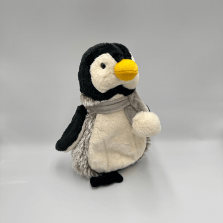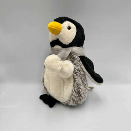 Pingwin Bukowski Sweet Julius nosi elegancki szary szalik ozdobiony białymi pomponami, który nie tylko dodaje mu zimowego uroku, ale także podkreśla jego wyjątkowy design. Jego delikatne opierzenie, przypominające młodego pingwinka, sprawia, że jest niezwykle uroczy i miły w dotyku.