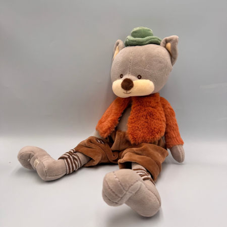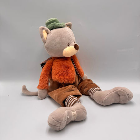 Remi to uroczy szary kotek Bukowski o wysokości 25 cm, przeznaczony dla niemowląt od pierwszego dnia życia. Ubrany jest w pomarańczową kurteczkę, brązowe spodenki oraz zielony kapelusik, co nadaje mu wyjątkowego charakteru.